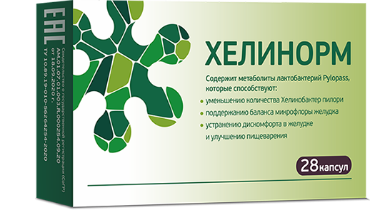 Инновационный продукт для борьбы с бактериями Хеликобактер пилори. В результате многолетних исследований, изучив более 8 000 штаммов микроорганизмов, немецкие ученые открыли особенный штамм лактобактерий, который обладает специфическим антихеликобактерным действием. Этот штамм получил коммерческое название Pylopass. Именно он и является действующим началом Хелинорма.