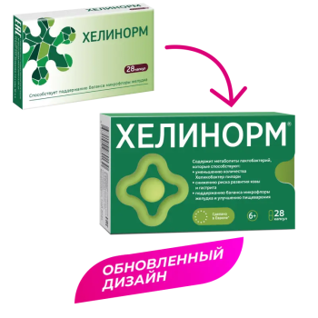 Хеликобактер пилори - это патогенная бактерия, обитающая в желудке человека, которой инфицировано приблизительно 50% населения всего мира. Является единственным известным на сегодняшний день микроорганизмом, способным длительно выживать в чрезвычайно кислом содержимом желудка и даже колонизировать его слизистую. Инфицирование Хеликобактер пилори может привести к воспалению слизистой оболочки желудка и двенадцатиперстной кишки. Многие случаи язв желудка и двенадцатиперстной кишки, гастритов, дуоденитов, рака желудка этиологически связаны с инфекцией Хеликобактер пилори. Однако у большинства (до 90 %) инфицированных носителей Хеликобактер пилори не обнаруживается никаких симптомов заболеваний. В результате многолетних исследований, изучив более 8 000 штаммов микроорганизмов, немецкие ученые открыли особенный штамм лактобактерий, который обладает специфическим антихеликобактерным действием. Этот штамм получил коммерческое название Pylopass-. Именно он и является действующим началом Хелинорма-. Особенность данных лактобактерий состоит в том, что они распознают поверхностные рецепторы клеточной стенки Хеликобактер пилори и связываются с ними. Образуются так называемые коагрегаты, которые естественным образом, через желудочно-кишечный тракт, выводятся из организма. В результате снижается уровень Хеликобактер пилори в организме, что способствует уменьшению риска возникновения заболеваний желудка и двенадцатиперстной кишки.