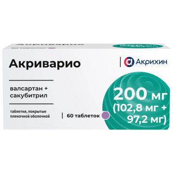 После приема внутрь комплекс валсартана и сакубитрила распадается на валсартан и сакубитрил, который затем метаболизируется с образованием метаболита – сакубитрилата; концентрации названных веществ в плазме крови достигают максимума через 2, 0.5 и 1.5 ч соответственно. Абсолютная биодоступность валсартана и сакубитрила после приема внутрь составляет 23% и ≥ 60% соответственно. Валсартан в составе препарата Акриварио обладает большей биодоступностью по сравнению с другими таблетированными формами.
