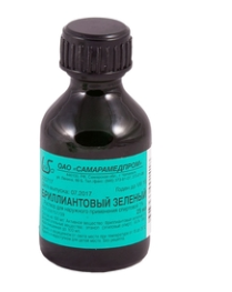 Взаимодействие с другими ЛС: Раствор бриллиантового зеленого несовместим с дезинфицирующими средствами, содержащими активный йод, хлор, щелочи, включая раствор аммиака.