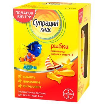 Супрадин Кидс – биологически активная добавка (БАД) к пище, витаминный комплекс для детей. Супрадин Кидс Рыбки – дополнительный источник витаминов С, В6, В12, холина и никотинамида (ниацинамида); Супрадин Кидс Мишки – дополнительный источник биотина, витаминов А, С, Е, D3, В6, В12, никотинамида.