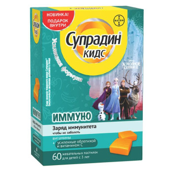 Кидс иммуно товарного знака Супрадин® биологически активная добавка к пище - комплекс витаминов, усиленный облепихой и витамином С, активирует иммунитет и позволяет не заболеть, поскольку снижает риск развития простудных заболеваний; восстанавливает силы организма в период выздоровления.