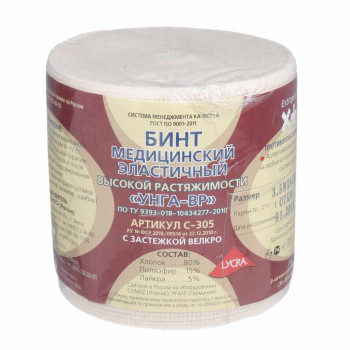 БИНТ МЕДИЦИНСКИЙ ЭЛАСТИЧНЫЙ ВЫСОКОЙ РАСТЯЖИМОСТИ «УНГА-ВР» С ЗАСТЕЖКАМИ-КЛИПСАМИ.